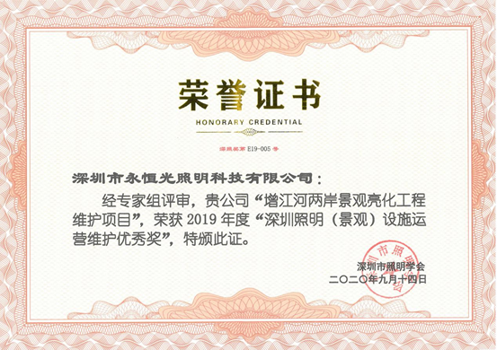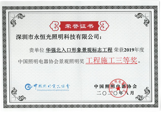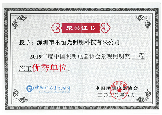 2020年8月2日,深圳市永恒光照明科技有限公司在“2020中國景觀照明產業大會開幕式暨中國照明電器協會景觀照明頒獎典禮”上,榮獲2019年度中國照明電器協會景觀照明獎工程施工優秀單位、2019年度中國照明電器協會景觀照明獎工程施工一等獎、2019年度中國照明電器協會景觀照明獎工程施工三等獎等3項獎項。