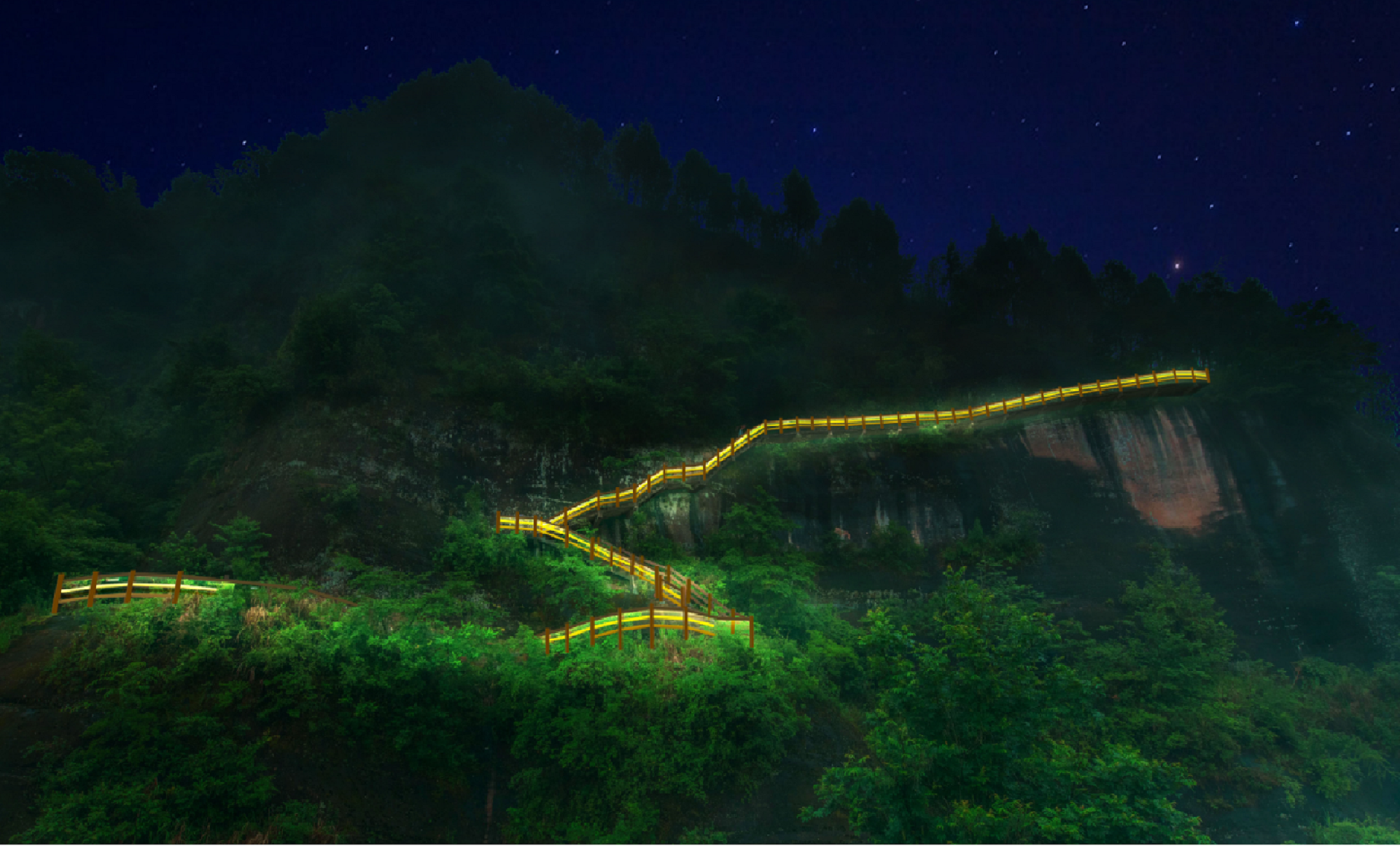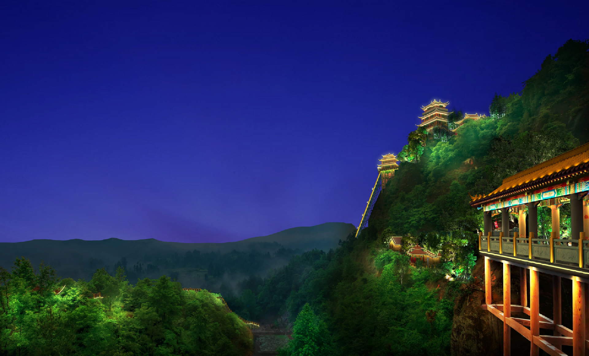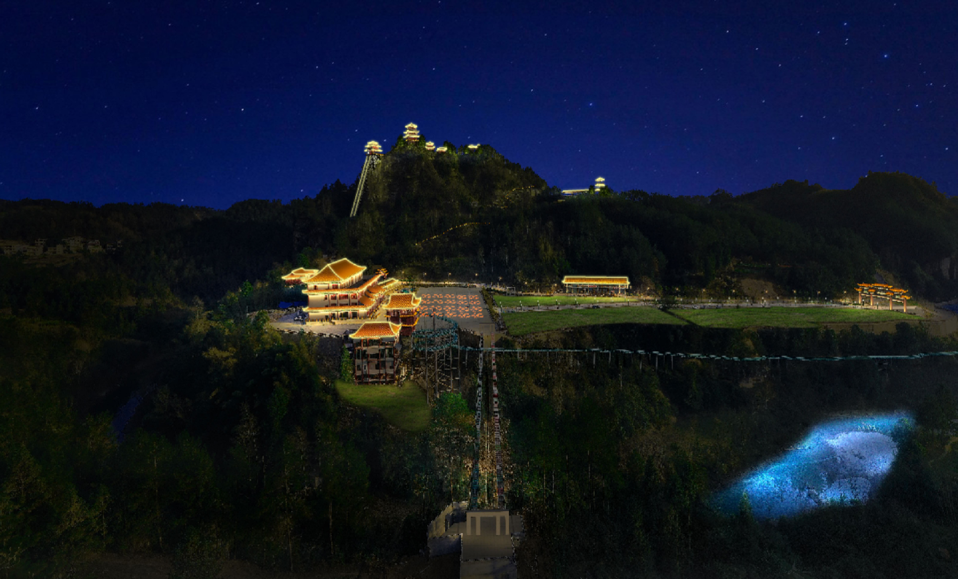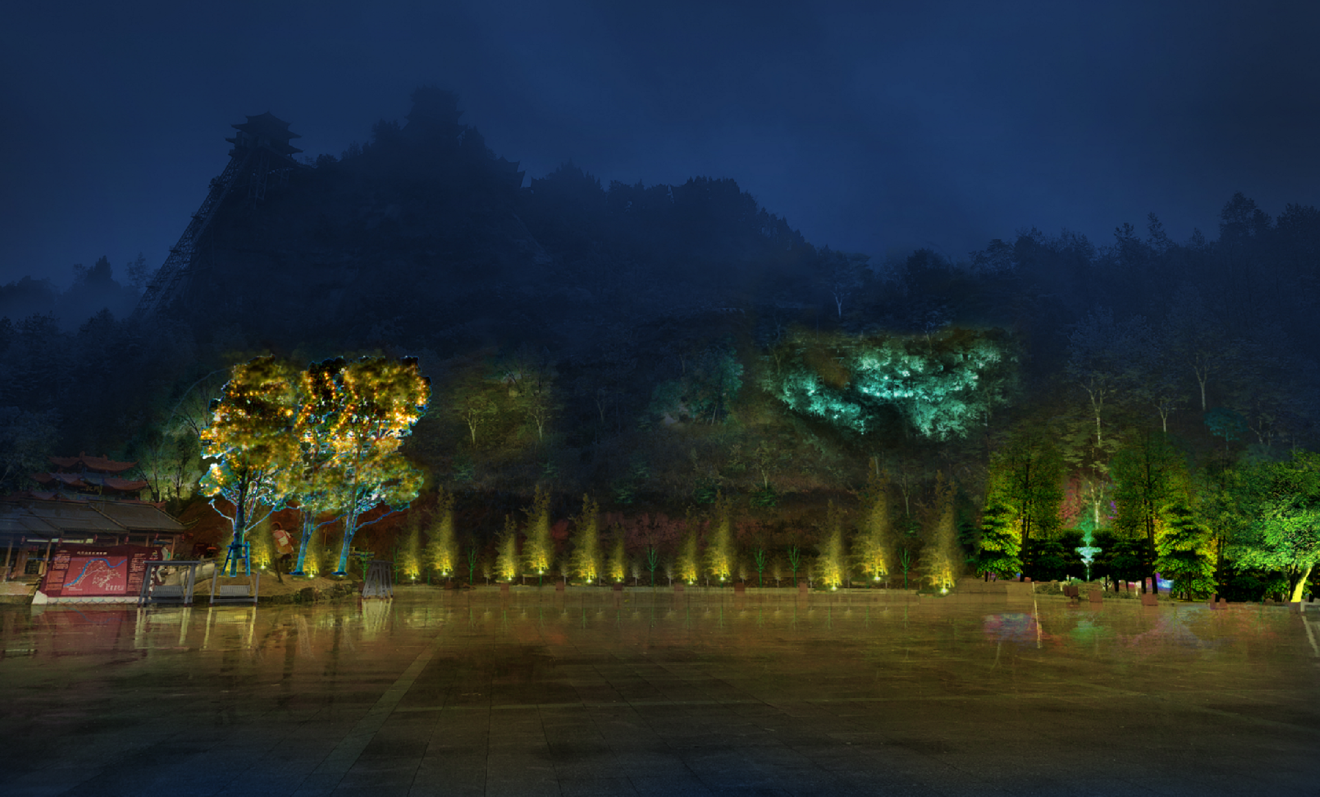 作為省內的“AAA”級景區,和景觀獨有的獨特環境,我們要表達到一種既顯得自然又突出現代繁華的氣息。所以主要設計為:建筑主要根據樓體的結構裝燈,主要采用明黃和暗金兩種色系襯托出建筑的特點,更顯佛教文化的莊嚴與肅穆,且盡量做到見光不見燈。同時采用投影燈圖案,娛樂設施亮燈,增加與游客的互動性。山林之間點綴彩色樹木,以達到山林、廟宇、游人共和諧的安寧、幽靜的效果。(在未來,當太平山景區日漸興盛,為了發展更好、更美、更優秀的燈光效果,此次設計僅為一級燈光效果設計,以后若有需要,可以在此次的設計上進行第二次設計)